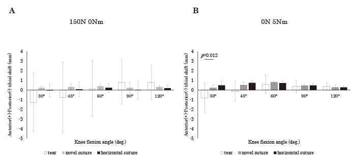 Fig. 7 Anterior and posterior tibial shift under (A) 150 N axial load, and (B) 5 Nm valgus torque. (A) Under the 150 N axial load, there are no significant differences in the shift of the tibia in each group. (B) Under the 5 Nm valgus torque, the tibia shifted posteriorly by a radial tear at 30° of knee joint flexion and improved significantly by the novel suture, but there is no significant difference at other knee joint flexion angles.